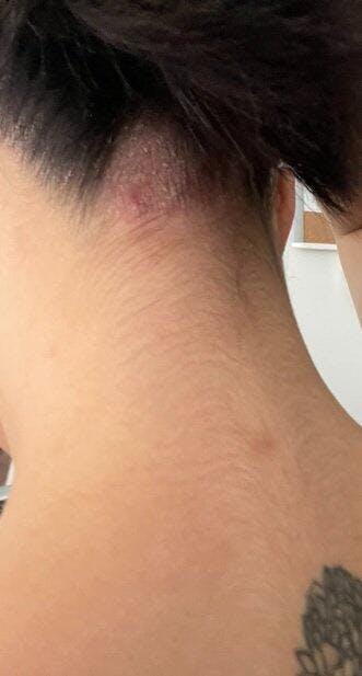 2. Aplique una capa fina de crema directamente en las áreas afectadas por enrojecimiento, descamación o irritación (cuero cabelludo, línea del cabello, detrás de las orejas o cuello).