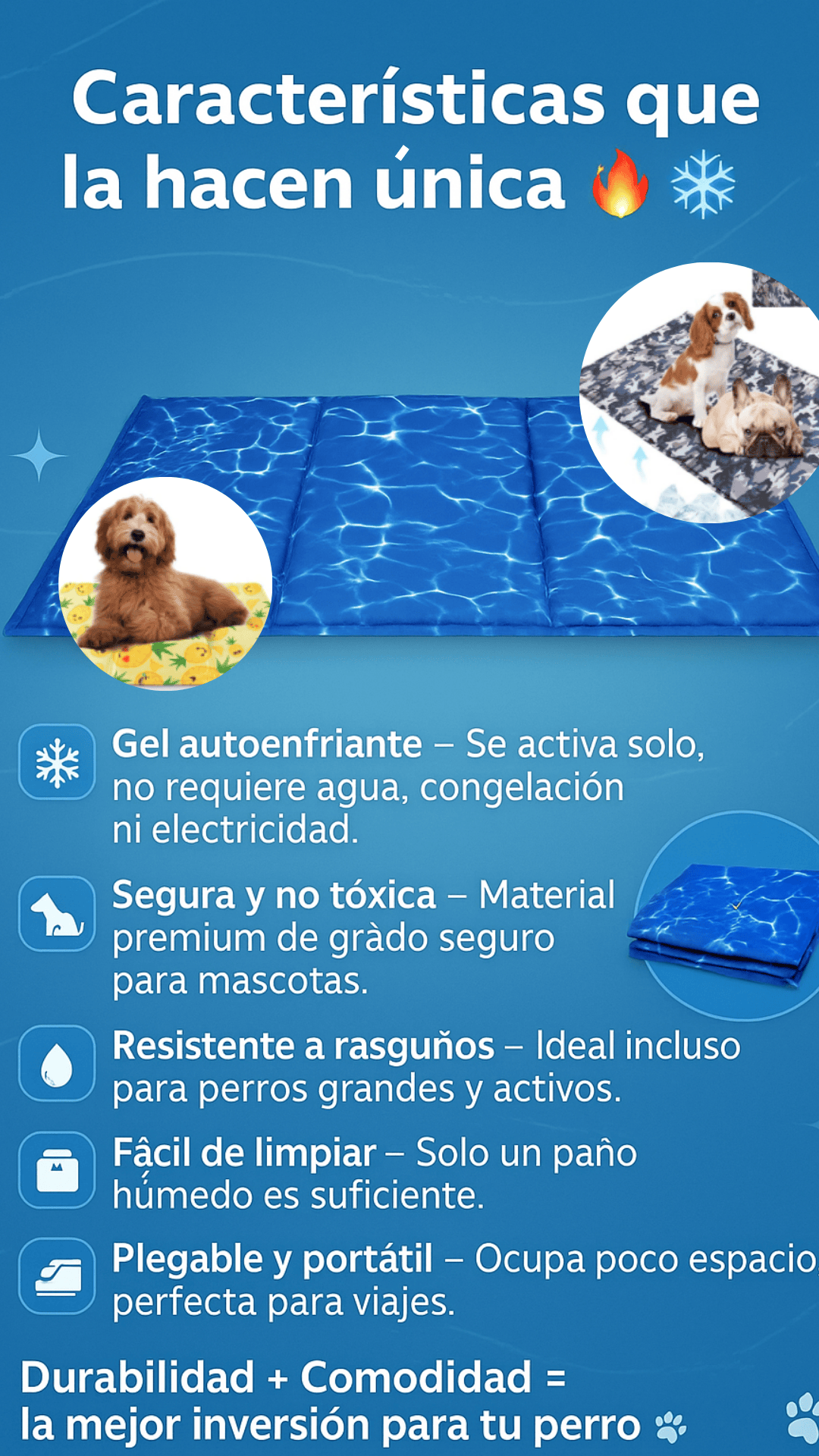 El gel no tóxico se activa con el peso de tu mascota, absorbiendo su calor corporal y disipándolo, sin necesidad de agua, electricidad o refrigeración previa.